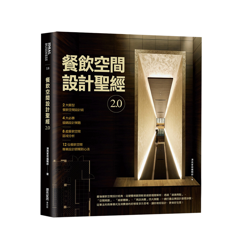 今年重磅改版的《餐飲空間設計聖經2.0》,旨於分享給餐飲創業者對於新時代飲食空間的品牌價值,從吸引消費者主動上門,再到提高人潮回流消費意願,透過書中編輯部統整的四大設計策略:「搶鏡亮點」、「空間規劃」、「細節體驗」、「再訪消費」,帶領讀者由外至內精準布局餐飲空間、升級品牌美學價值,打造令顧客驚艷的超人氣餐飲空間優勢!