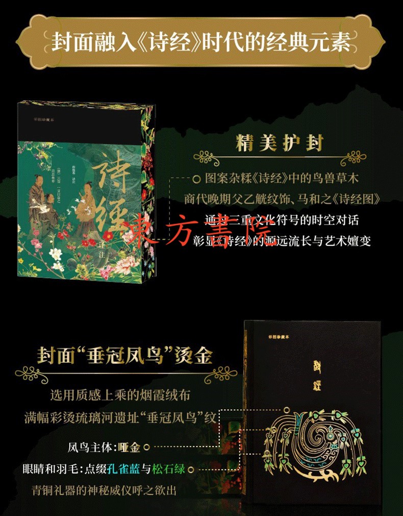 ★封面圖案雜糅《詩經》中的鳥獸草木、商末周初的父乙觥、“南宋四大家”馬和之《詩經圖》等歷代影像及文物元素,彰顯《詩經》文化的源遠流長與藝術嬗變。