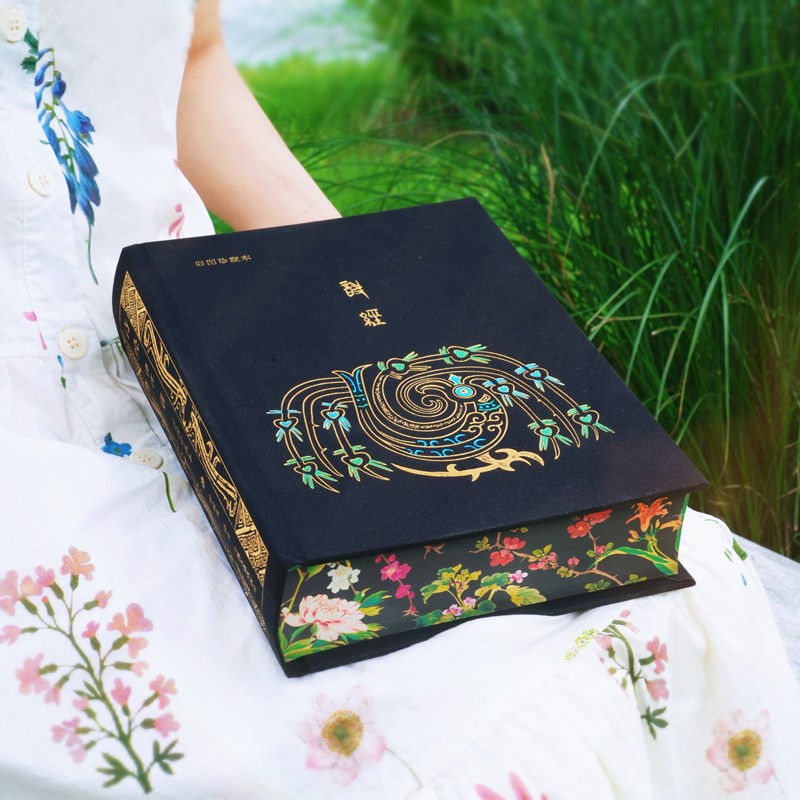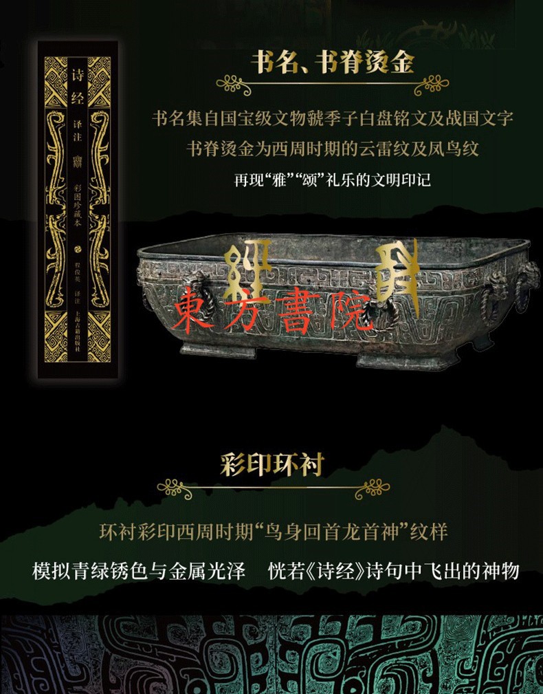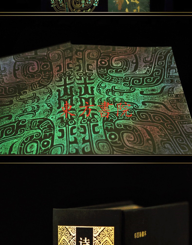 ★書脊燙金為西周時期的雲雷紋及鳳鳥紋,環襯圖案則為“鳥身回首龍首神”紋樣,在光線下流轉出青綠鏽色與華麗的金屬光澤。
