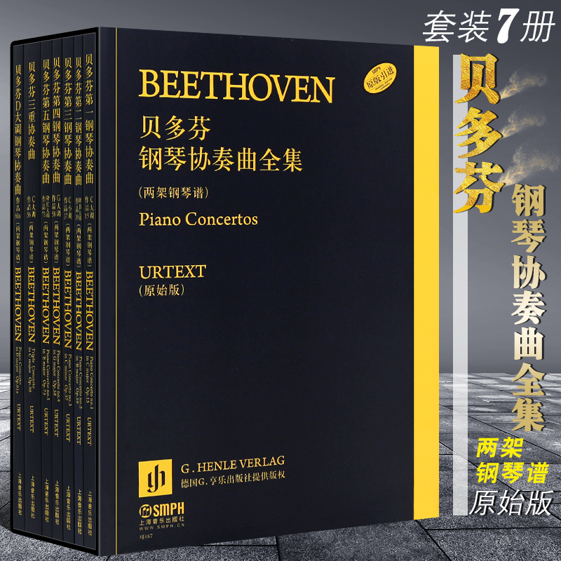 《貝多芬鋼琴協奏曲全集·兩架鋼琴譜:原始版(套裝7册)》內容簡介:2010年是貝多芬誕生240周年,上海音樂出版社為此從德國G.亨樂音樂出版社引進出版貝多芬的鋼琴協奏曲集,包括兩架鋼琴譜和袖珍總譜兩種。 這個曲集除了五首鋼琴協奏曲外,還收入了由貝多芬自己改編的《D大調小提琴協奏曲》的鋼琴版(Op.61a)和《c大調鋼琴、小提琴、大提琴三重協奏曲》(Op.56),除了為鋼琴、合唱與樂團寫的《合唱幻想曲》(Op.80)之外,這裡囊括了貝多芬所有為鋼琴和樂團而寫的有作品編號的作品。