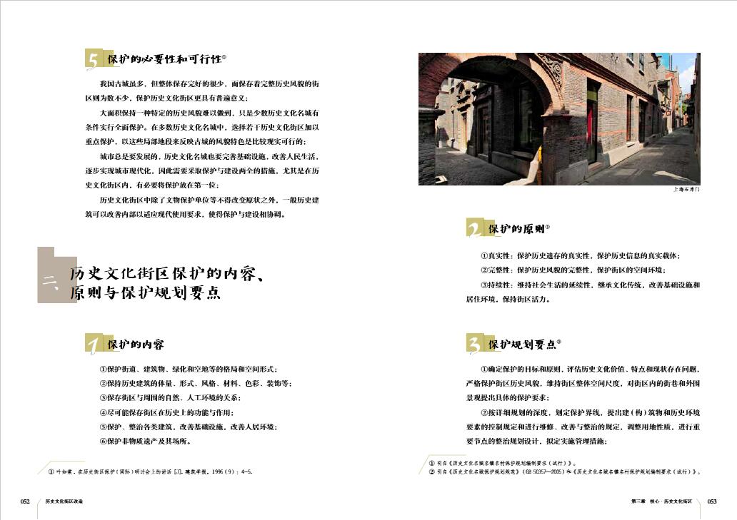 (1)完善而豐富的理論:讓讀者了解相關領域的規範及需要注意的事項,為改造設計提供有據可依的立足點。對基本概念的詳細解釋和通俗易懂的分析文字更易於讀者對歷史文化街區的相關知識進行理解。